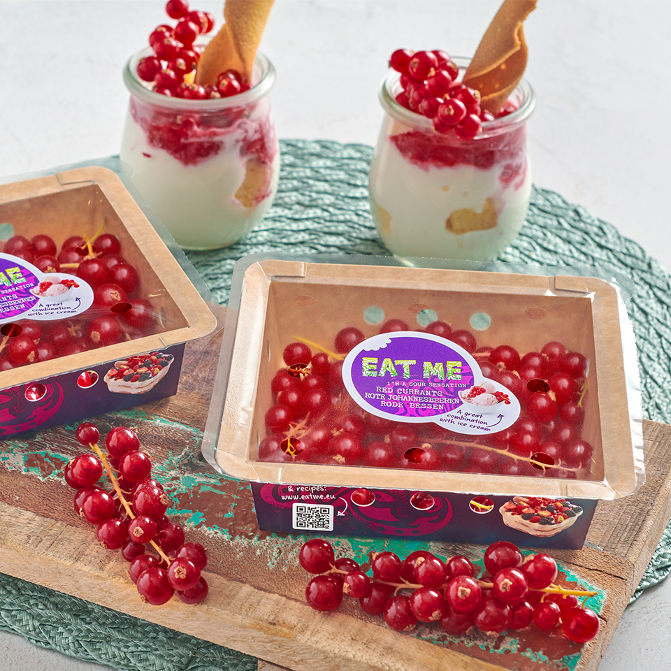 EAT ME is our consumer brand through which we inspire consumers to enjoy the tastiest fruits and vegetables more often and with a good feeling. Our redcurrants have an extensive range of eye-catching EAT ME packaging. All packaging has been developed with care for people & nature: