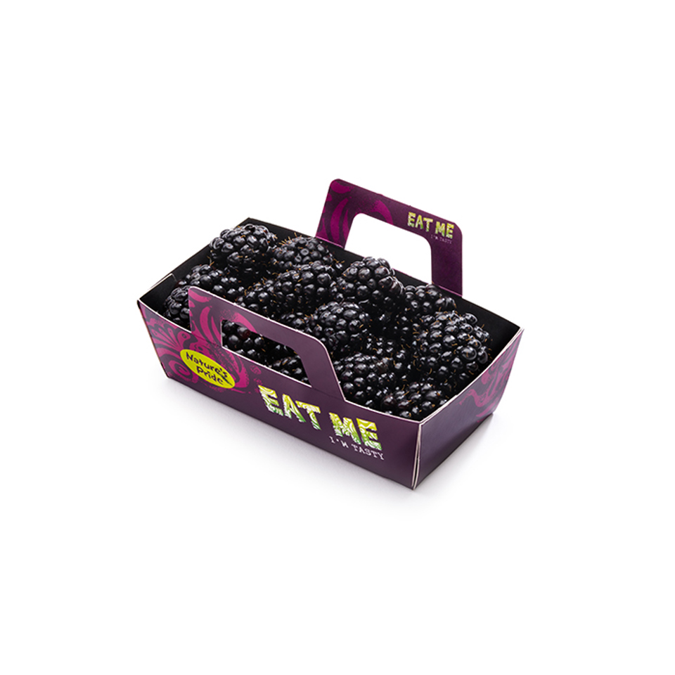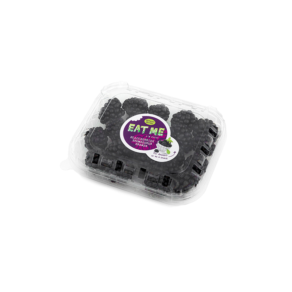 Suministramos moras en diferentes envases de EAT ME. Los más populares son las bandejas de cartón o plástico de 125 gramos: estos se venden en bultos de 12 x 125 gramos. En ellos, la calidad del producto se conserva a la perfección.